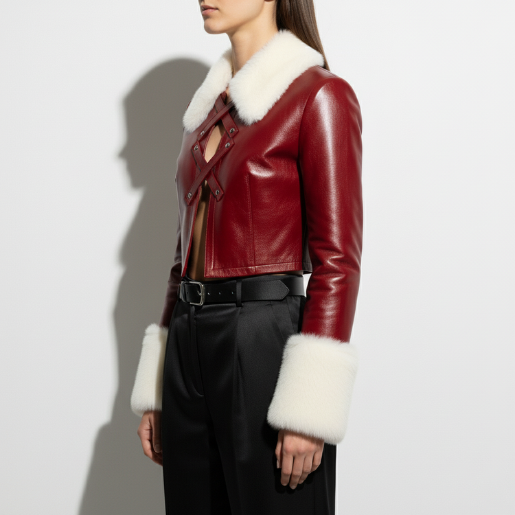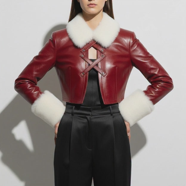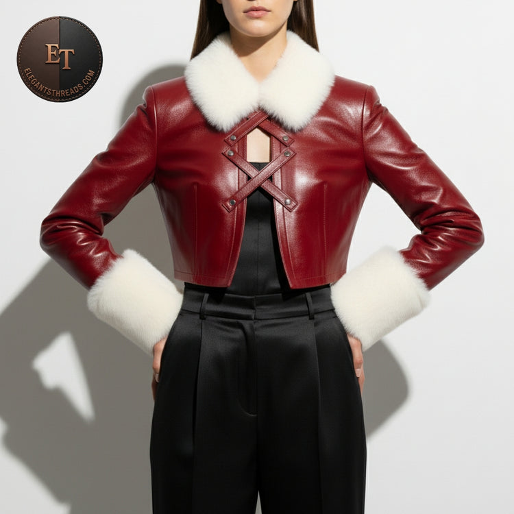Step out in style with this luxury cherry-red cropped leather jacket, designed to combine edgy elegance with winter warmth. Featuring a criss-cross strap closure, soft white faux-fur collar & cuffs, and a flattering cropped fit, this jacket is perfect for holiday parties, festive nights, or chic winter outings.
