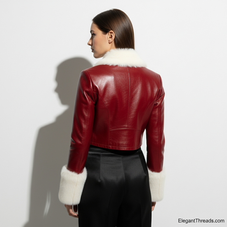 “🔥 Sexy Cherry-Red Cropped Leather Jacket | Luxury Christmas Holiday Fur Trim ❄️ ElegantThreads”
