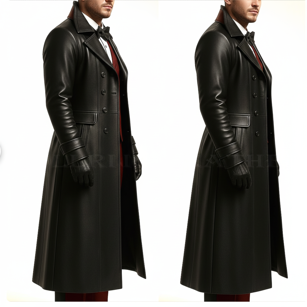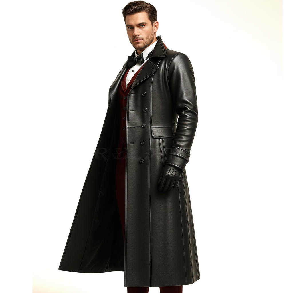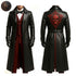 Step into the dark elegance with this Gothic Vampire Leather Trench Coat, featuring a black base with red skeleton design on the back. Coat slightly open to reveal inner outfit, perfect for cosplay, gothic fashion, photoshoots, or Etsy/Shopify listings.