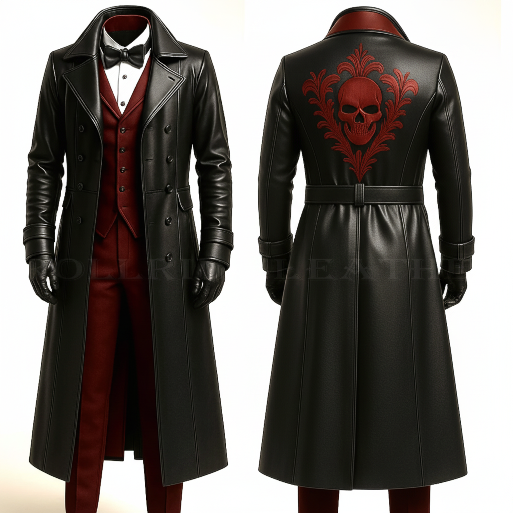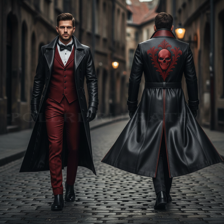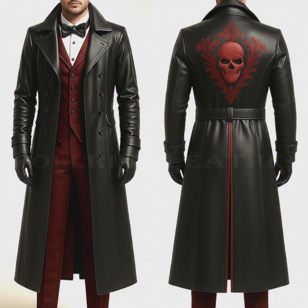 Gothic Vampire Trench Coat – Black with Red Skeleton Design, Full-Length Leather, Handmade, Open Front