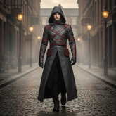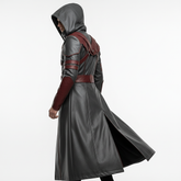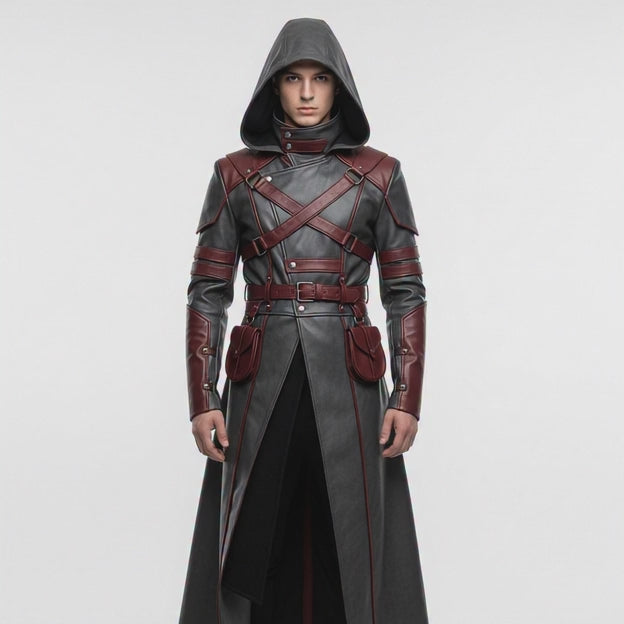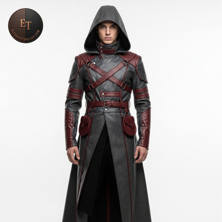 Step into a world of stealth and style with this handmade shadow grey and maroon assassin leather coat. Perfect for cosplay, gothic, and high-fashion winter wear, this coat is a statement piece designed to impress.