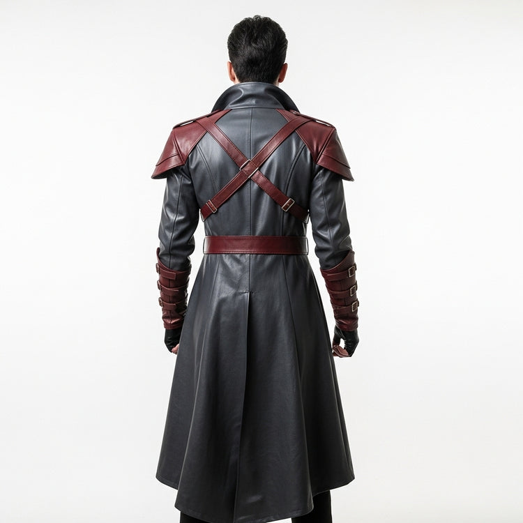 Handmade Shadow Grey & Maroon Assassin Leather Coat | Luxury Cosplay Long Tail Jacket