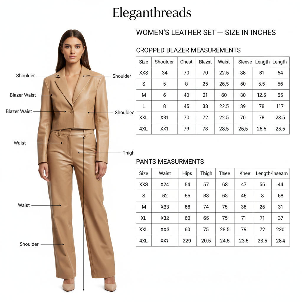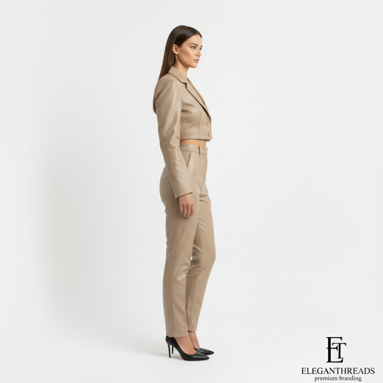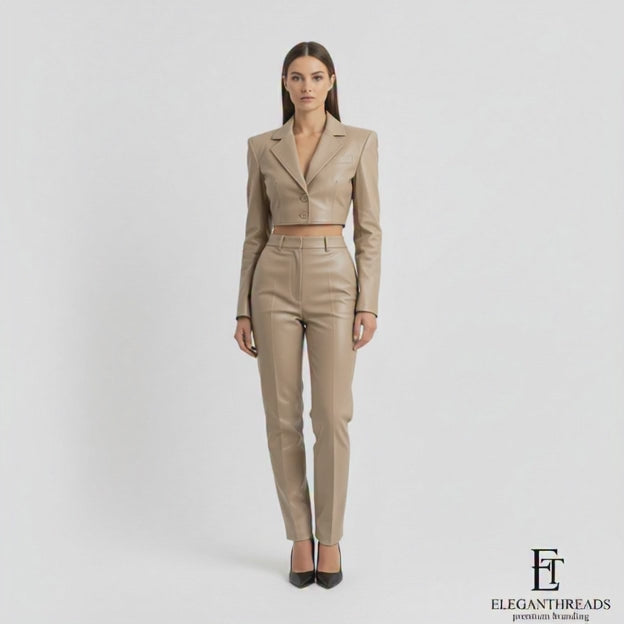 Luxury Cropped Beige Lambskin Leather Blazer & Pants Set for Women | Tailored Slim-Fit Lightweight Spring Outfit – Eleganthreads