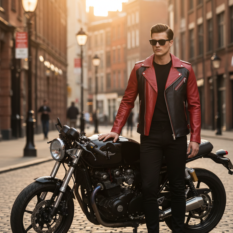 The combination of red passion and black elegance makes this a standout piece that elevates every outfit. Whether you’re cruising on your bike or making an entrance at a party, this jacket says “luxury meets attitude.”