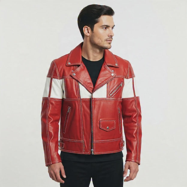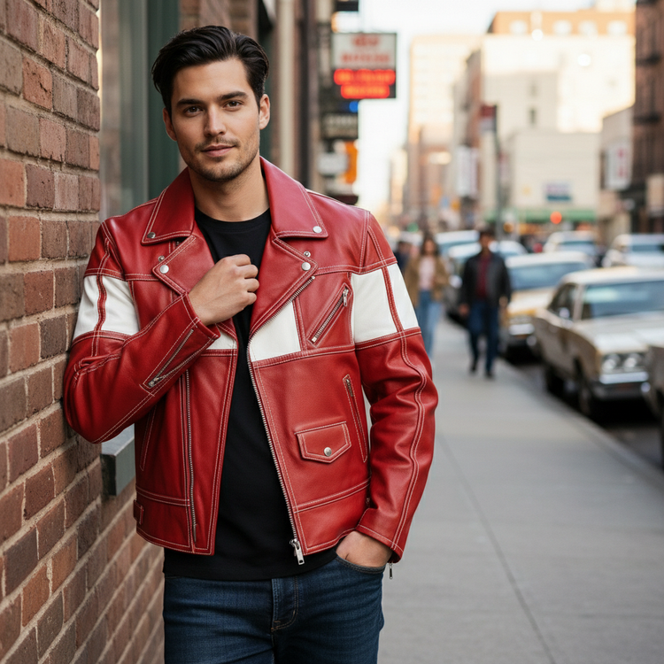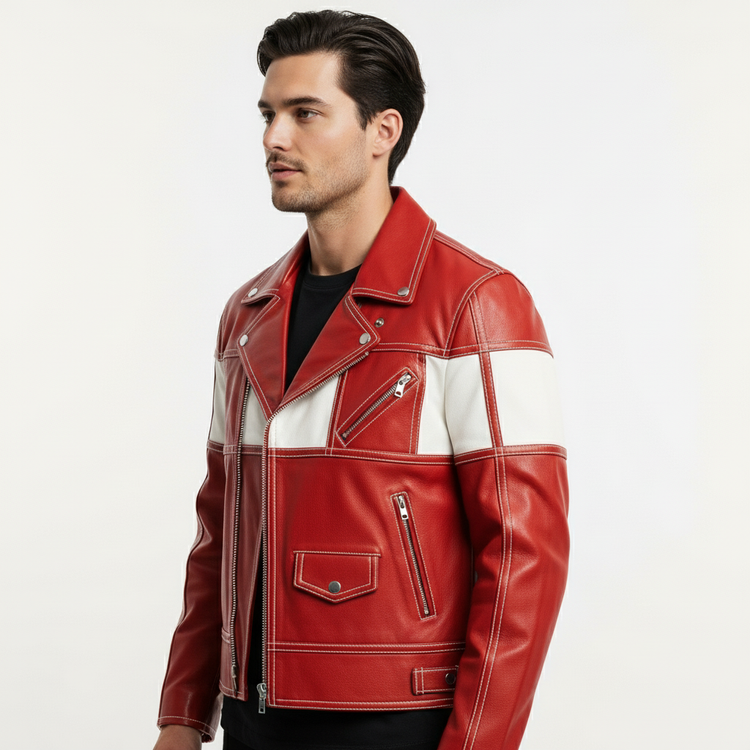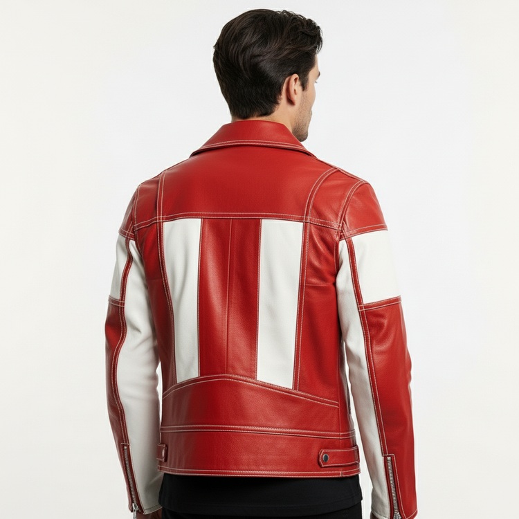 This retro-inspired leather jacket features bold red & white block patterns, thick premium stitching, and a slim tailored fit, capturing the essence of 1980s racing style 🏁❤️
