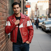 Men’s Vintage Red & White Racing Biker Jacket – 1980s Leather Retro Jacket – Slim Fit Motorcycle Outerwear – Holiday Gift for Him