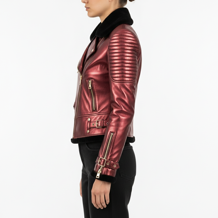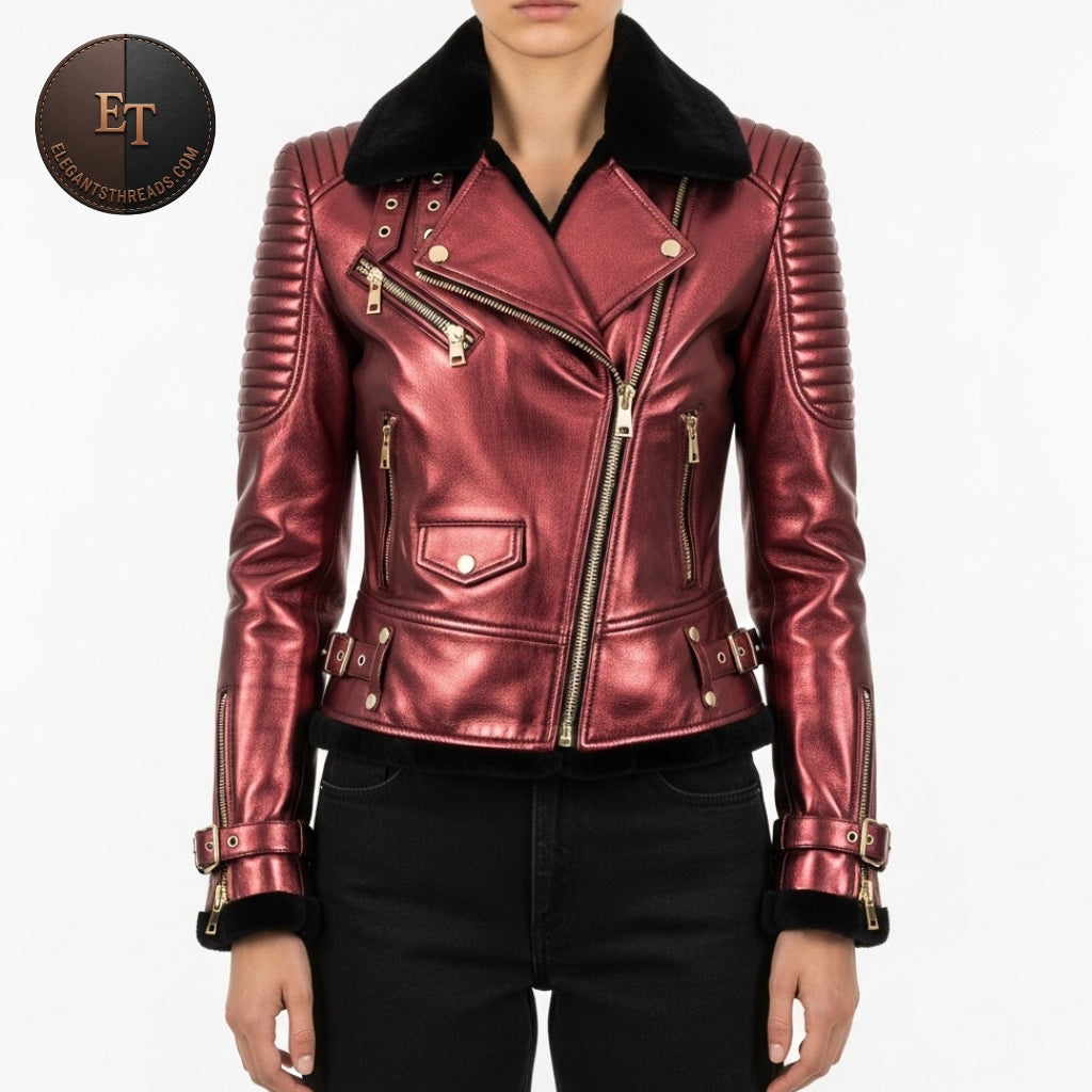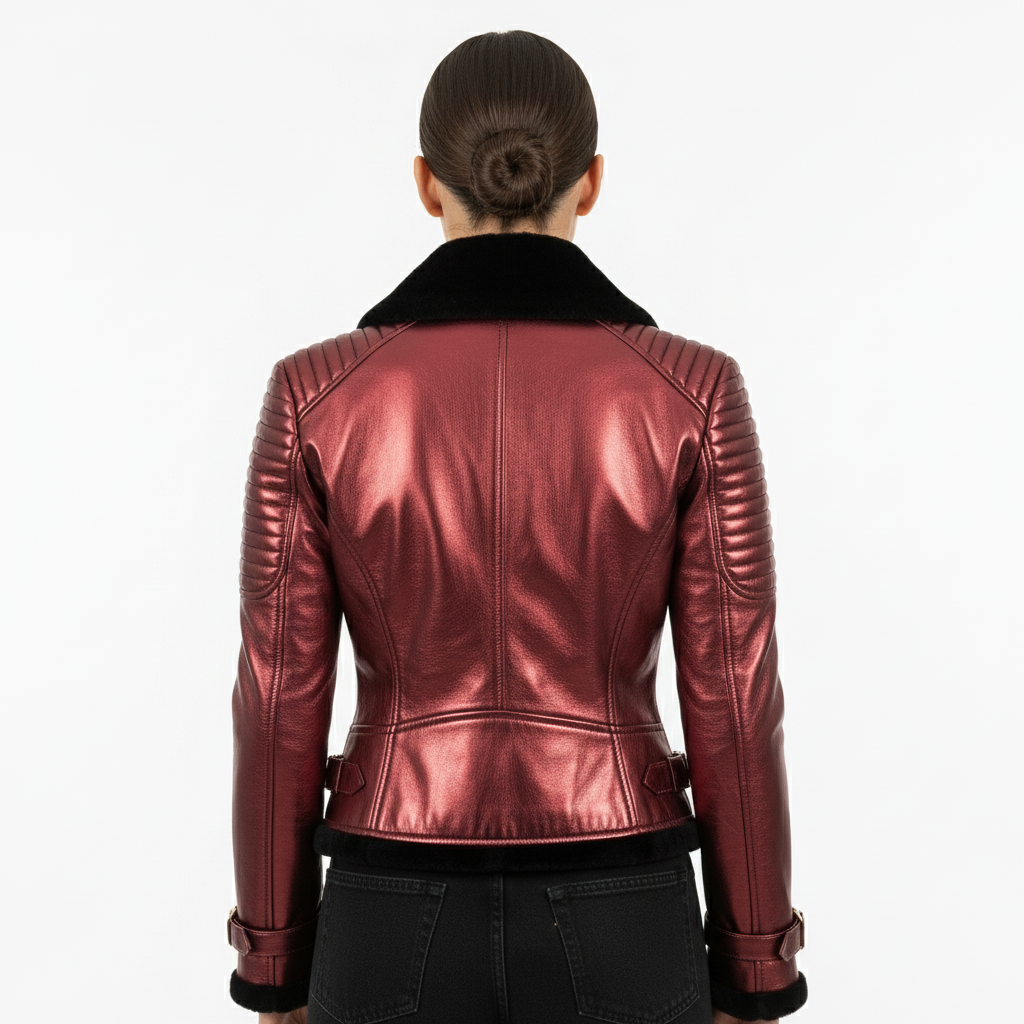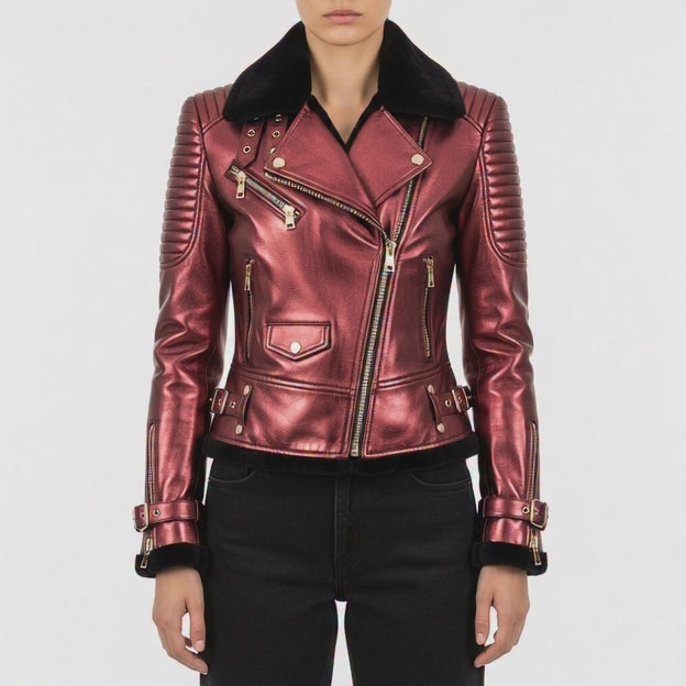 Metallic Burgundy Leather Jacket for Women | Cropped Luxury Moto Coat with Fur Collar | High Fashion Winter Streetwear Trend 2025