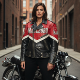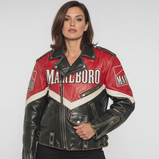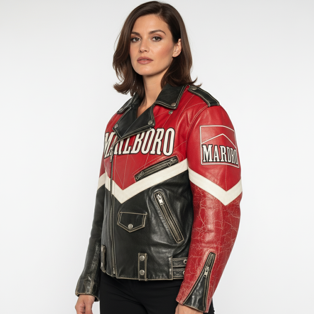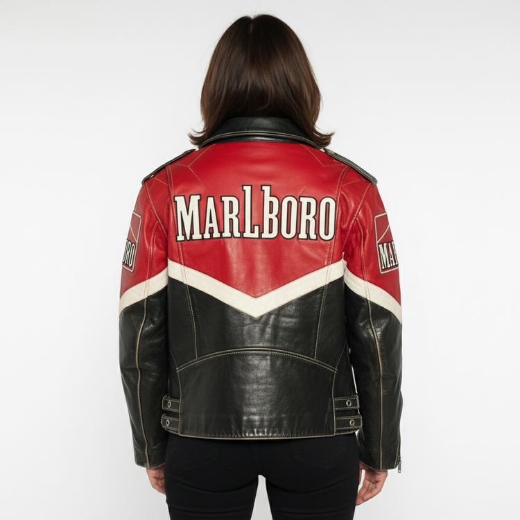"🔥 Turn heads with this vintage 1980s Marlboro-style biker jacket! 🏍️ Featuring a bold red & white retro design 🎨, rugged worn leather texture 🧵, and detailed stitching ✂️, this jacket is the perfect mix of classic biker style 🕶️ and high-fashion edge ✨.