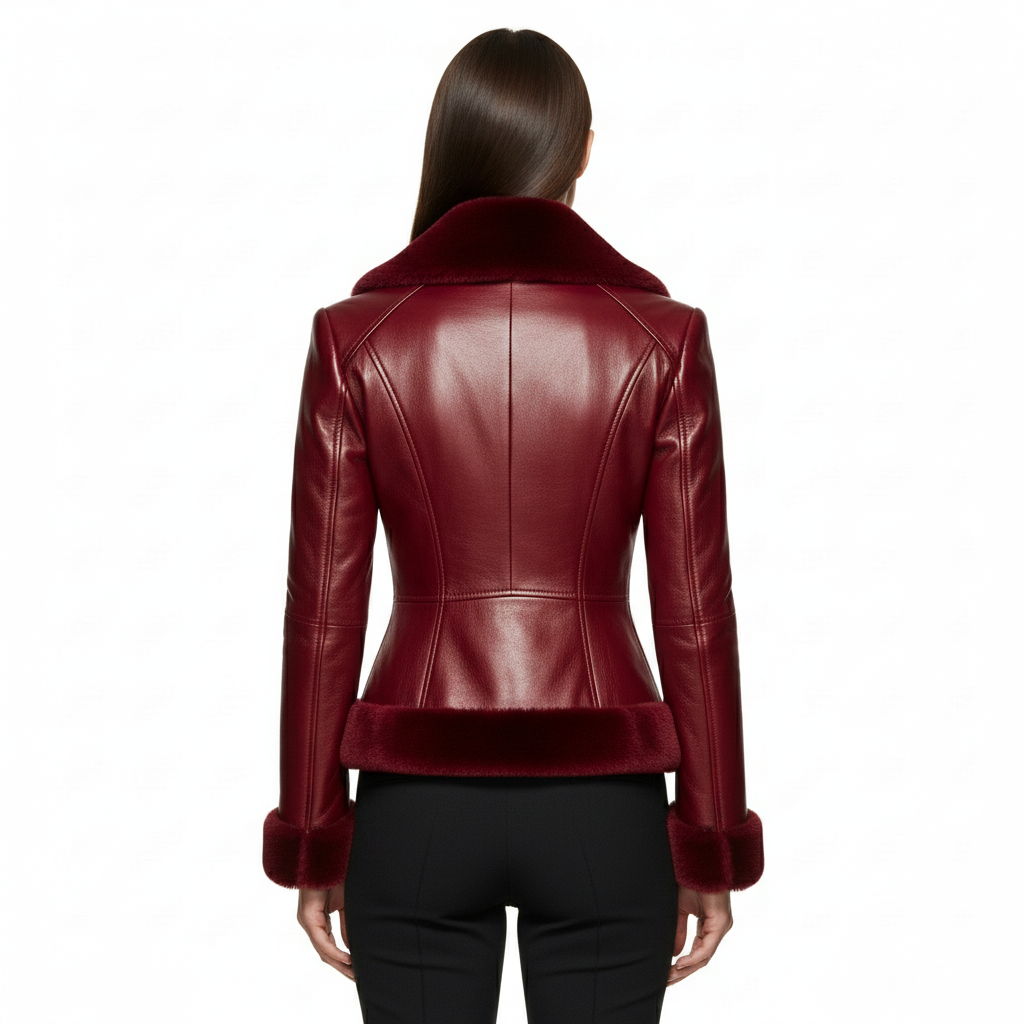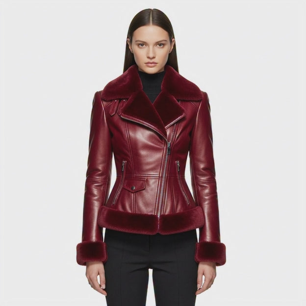 Crafted from premium genuine leather in a deep crimson red tone, it features a soft faux fur collar and cuffs, diagonal zipper closure, and a slim fitted waist that flatters every silhouette.