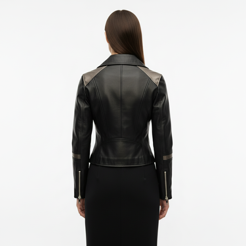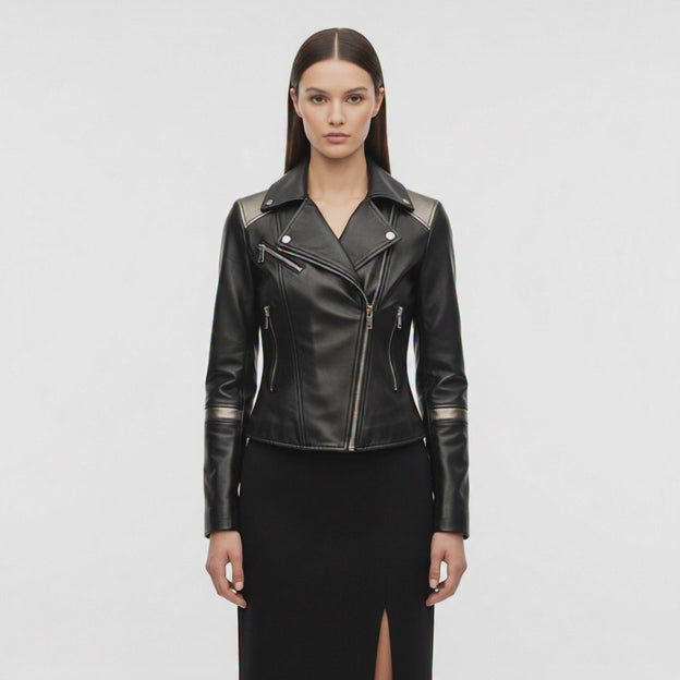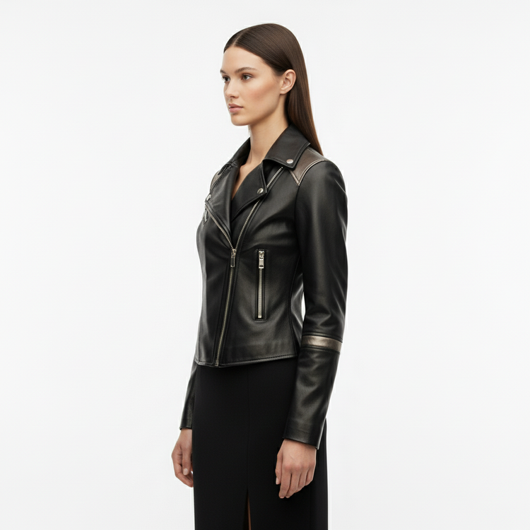 Step into fashion-forward elegance with this VIP Women’s Leather Jacket. Designed for women who love unique, modern, and stylish outerwear, this jacket features asymmetrical zippers, metallic shoulder and sleeve accents, and a sleek, fitted silhouette. Perfect for Etsy, Shopify, or any fashion showcase.